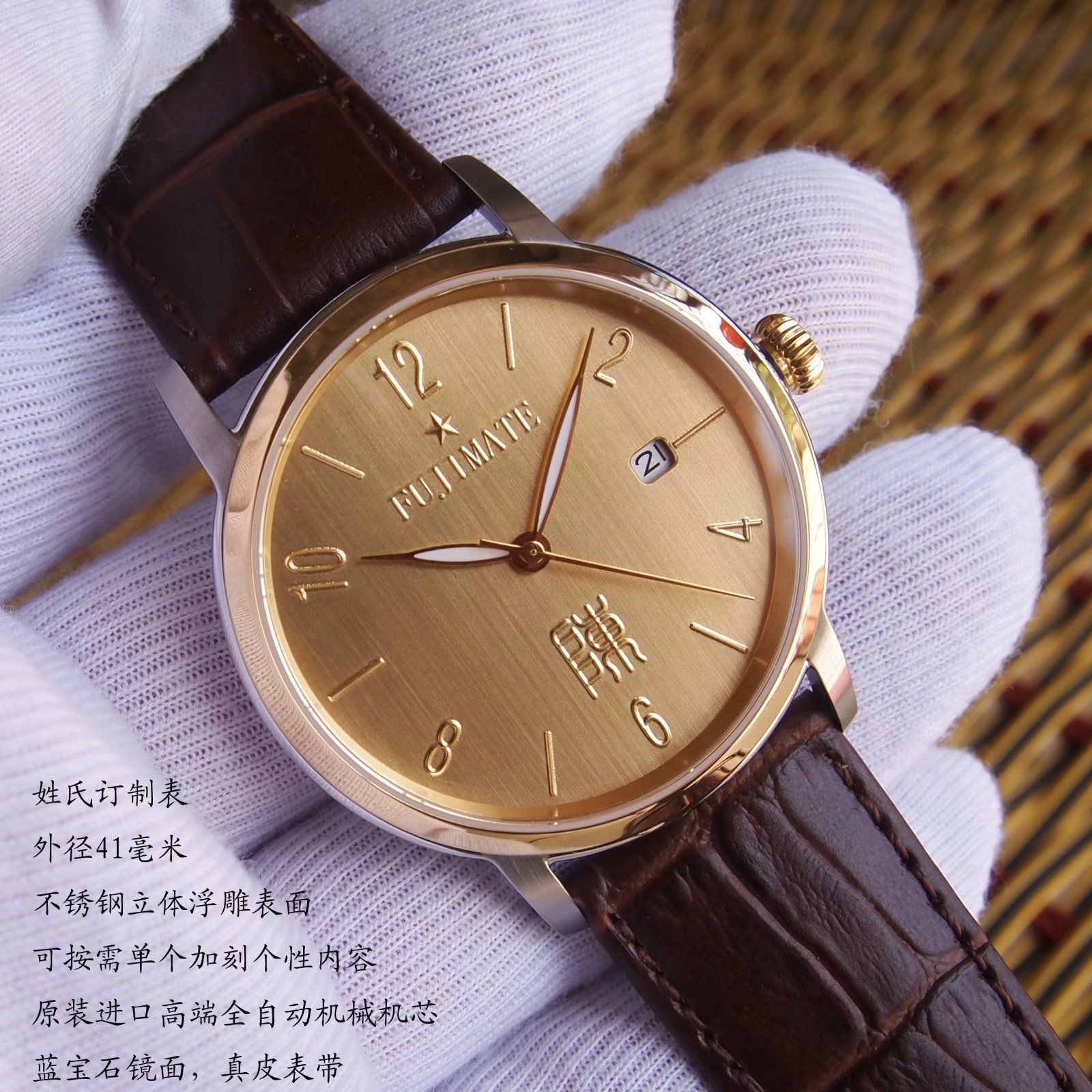 富士M6882K6间金单历姓氏立体浮雕个性订制全自动机械男表
