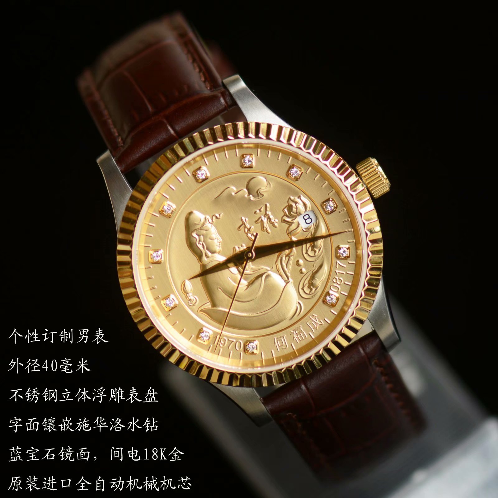 FALECE梵力时不锈钢立体浮雕观音+姓名+出生年月日个性订制全自动机械表-原装瑞士2836机芯